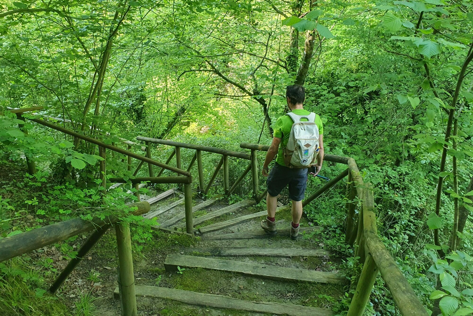 Dal centro storico di Sant’Angelo in Pontano si prosegue su via Roma fino ad imboccare Contrada L’Immacolata sulla destra. Da qui si continua fino all’incrocio che porta a Santa Maria Maddalena. Si prosegue sul panoramico crinale che nelle giornate più terse regalerà ampi panorami. Dopo circa 4 km, all’altezza di un’edicola, si svolta a destra e si scende verso la statale costeggiando i ruderi di una chiesa. Attraversato il ponte sul torrente Fiastra si arriva al Mulino del Monte (detto Mulino Salvucci), antico mulino che ad oggi ancora produce farina di mais. Nello stesso punto, ben nascosta, si trova una piccola cascata, che, nei mesi primaverili regala il suo spettacolo migliore. Si prosegue attraversando la statale e con una ripida salita si procede verso contrada Moline fino ad arrivare a Via Papa Giovanni XXIII dalla quale si arriva all’ingresso a San Ginesio dalla cosiddetta “Porta Picena”.