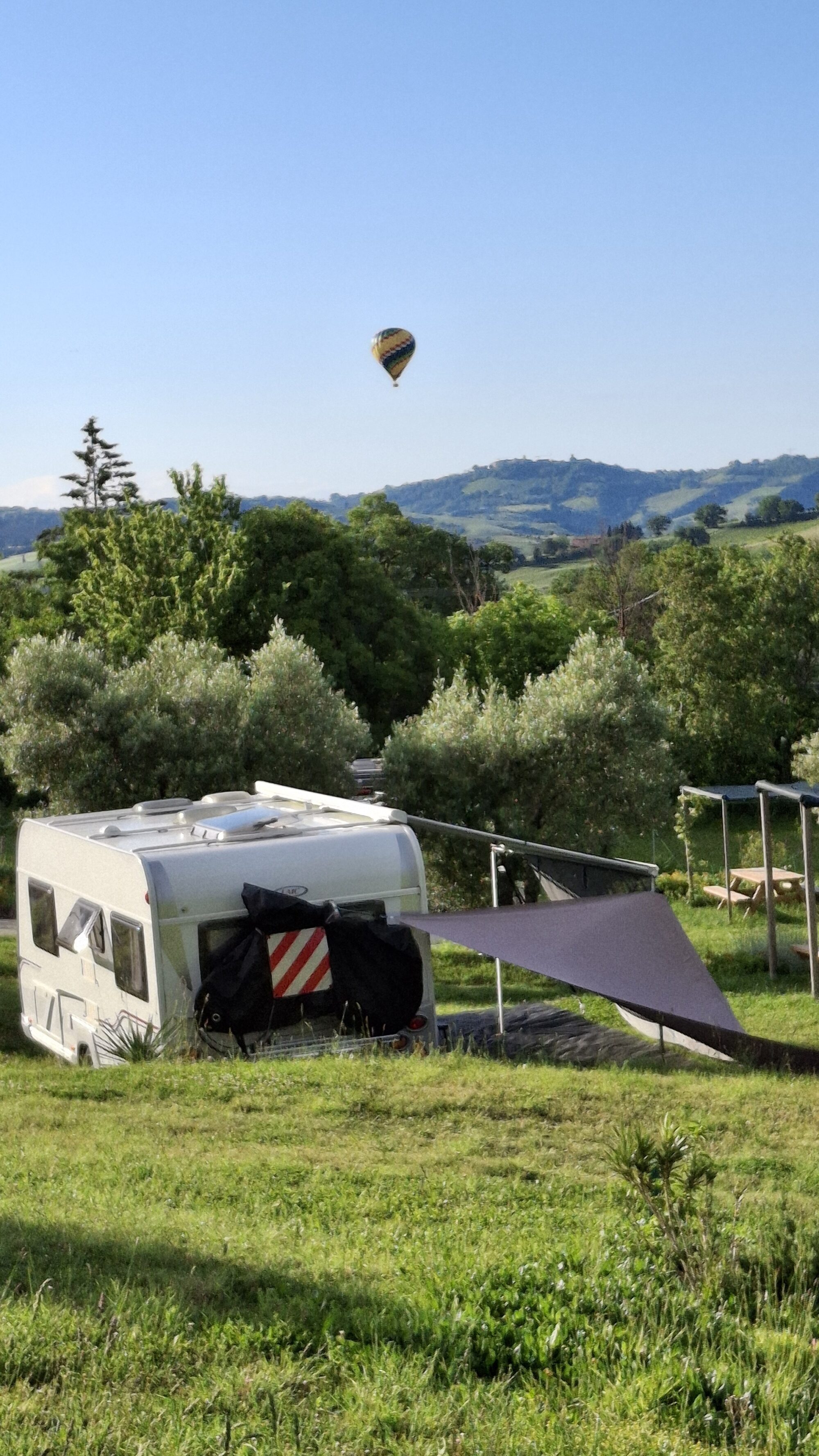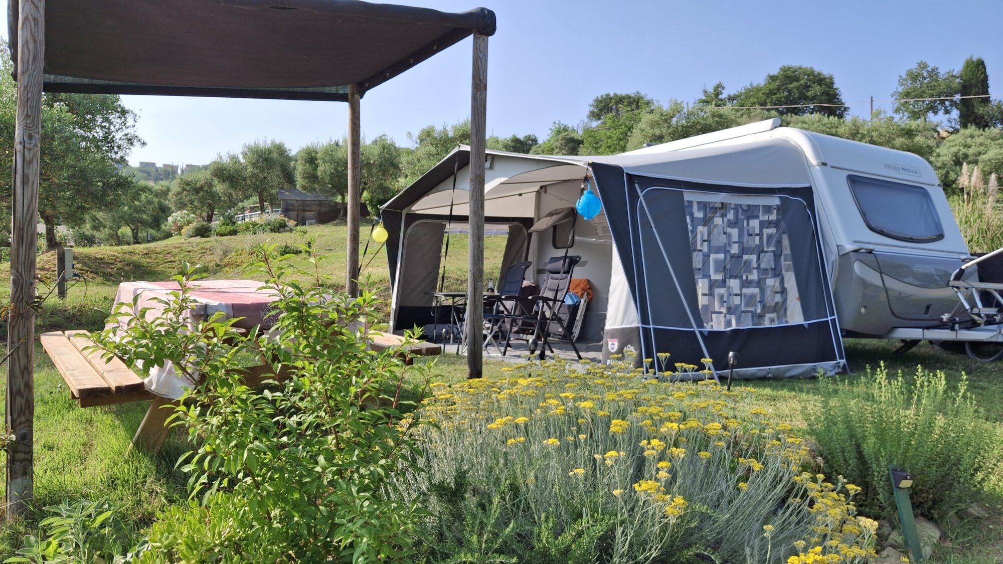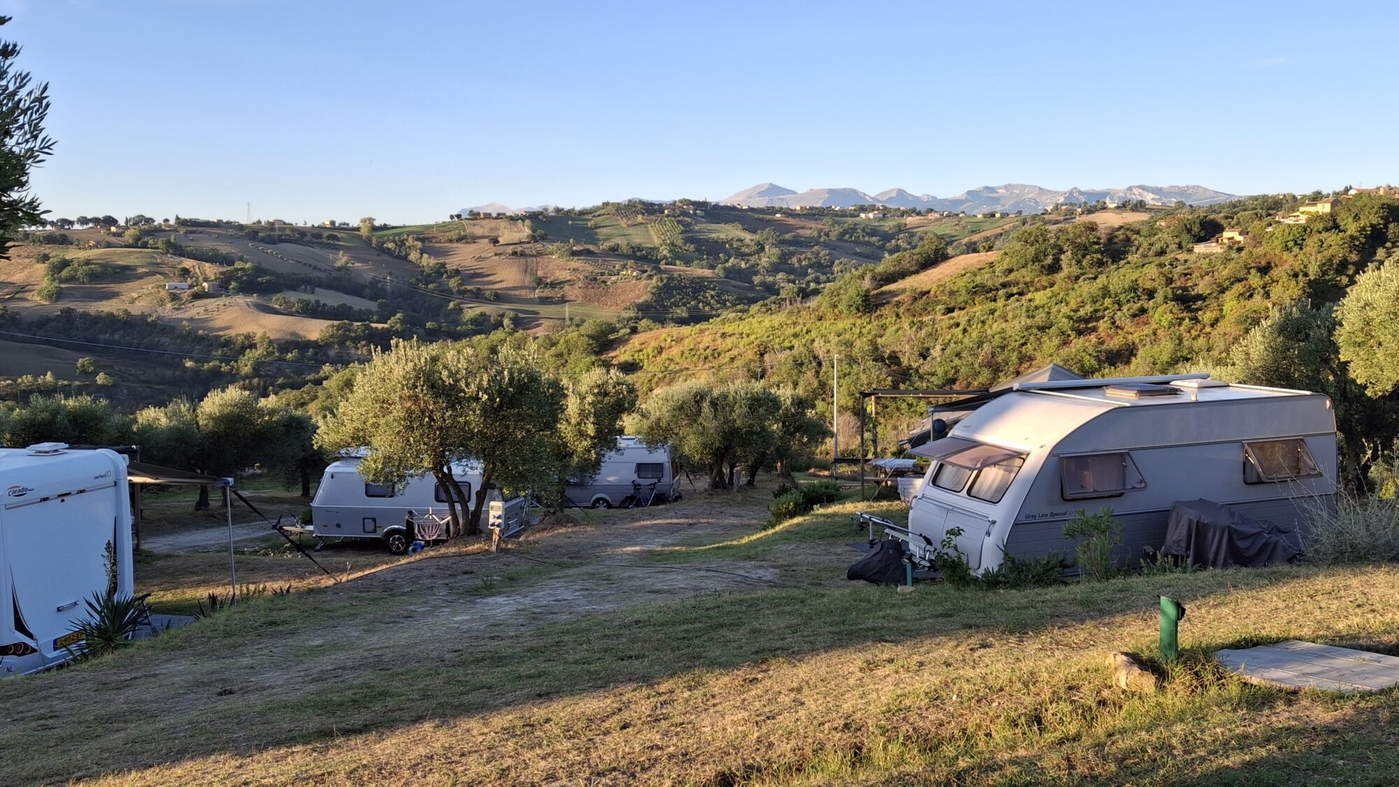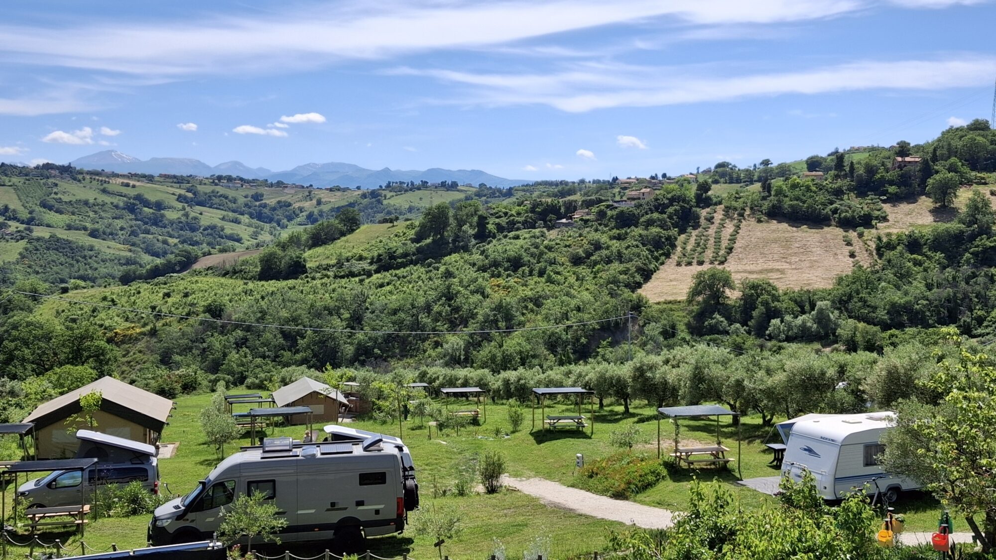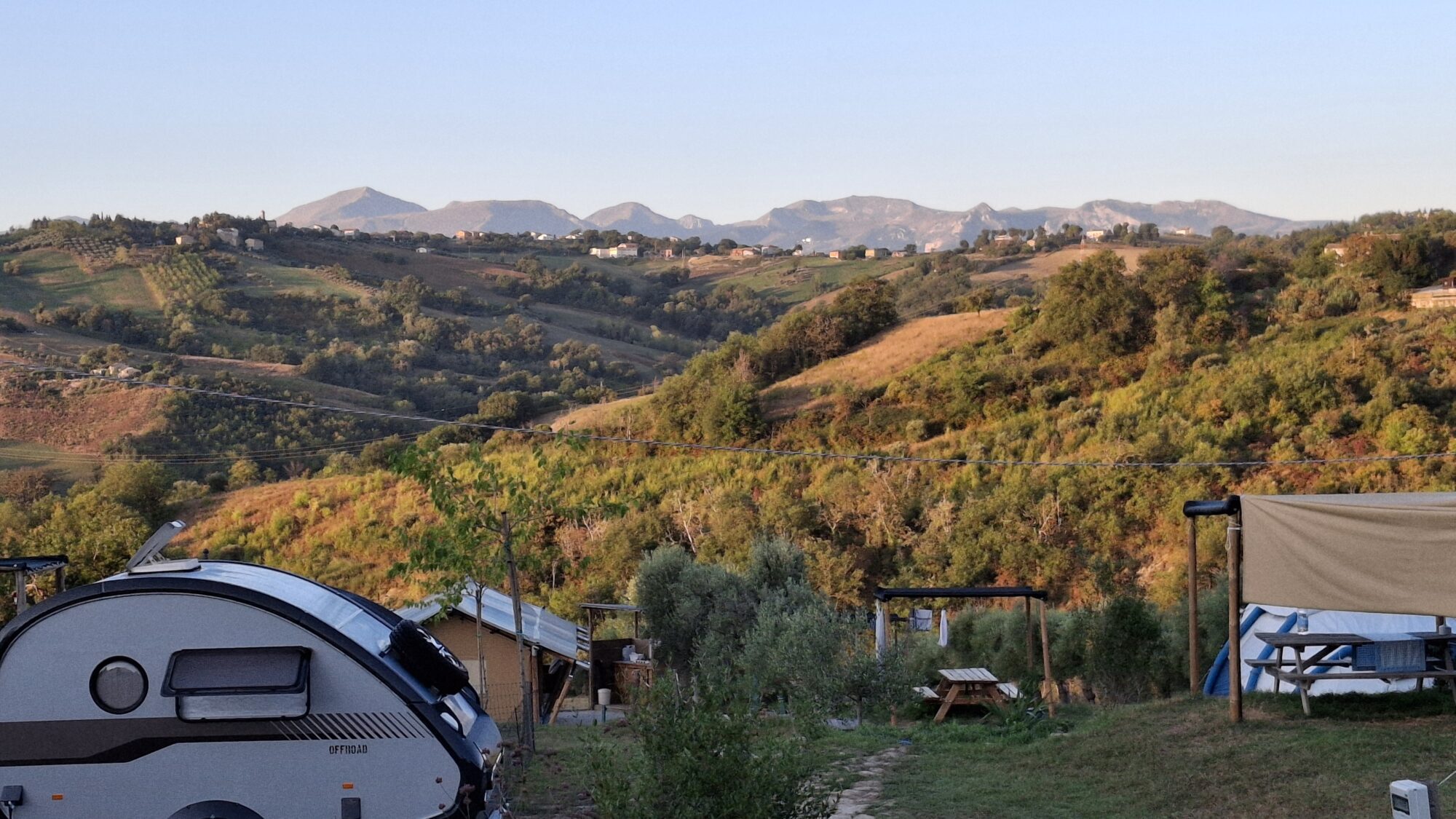 Situato in un contesto tranquillo e panoramico, offre ampi spazi attrezzati per accogliere tende, roulotte e camper, garantendo servizi essenziali come aree di sosta delimitate, accesso a punti di acqua potabile, scarico acque reflue e connessione elettrica.